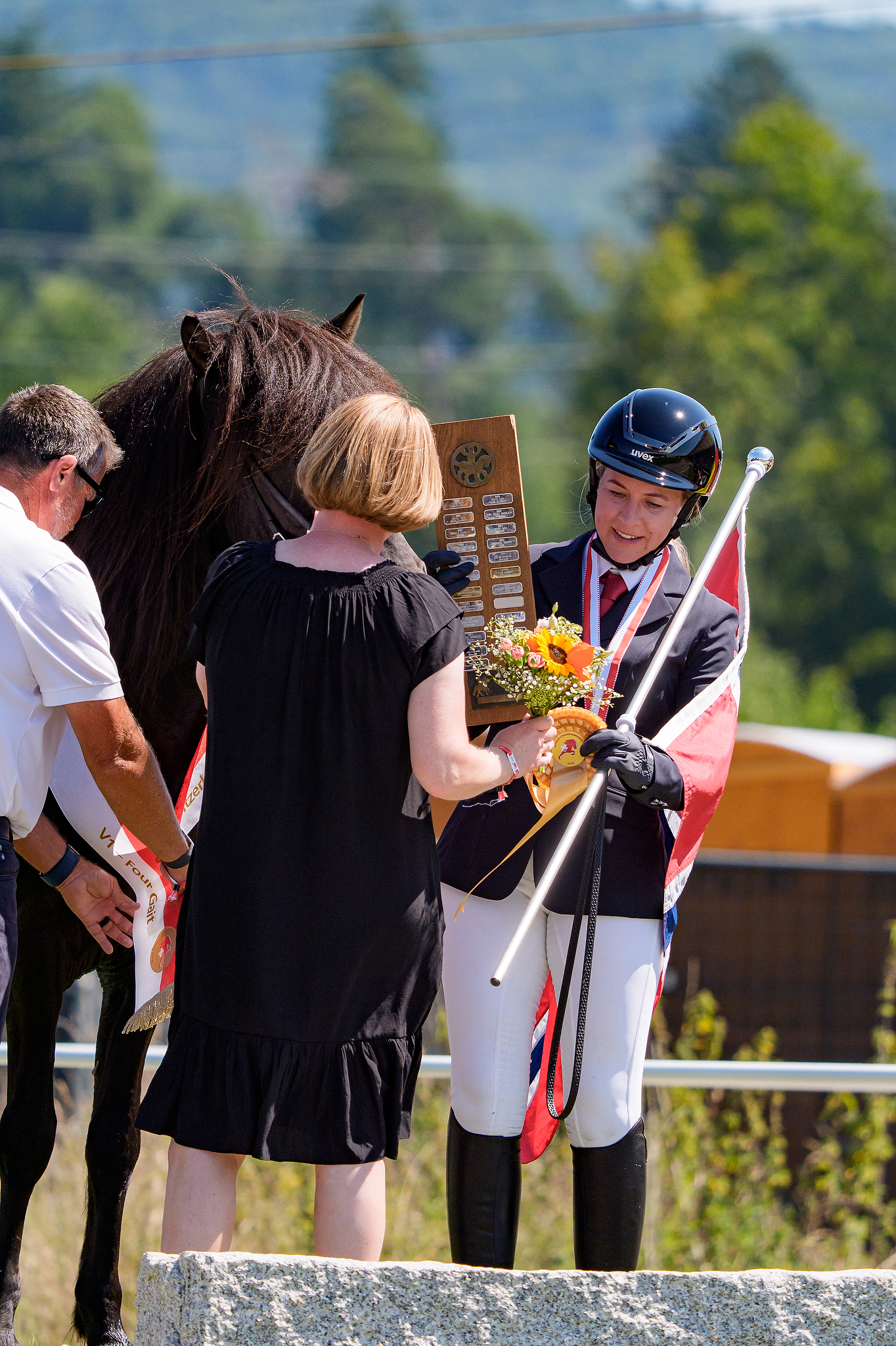 Anne Stine Haugen på podiet i Schweitz som verdensmester i firgang. Her får hun overrakt en landepris af Dansk Islandshesteforenings formand, Dorthe Præstholm Schneider. Det er en tradition, at medlemslandene i FEIF uddeler landepriser til VM, og Danmark uddeler altid prisen til vinderen af firgang.