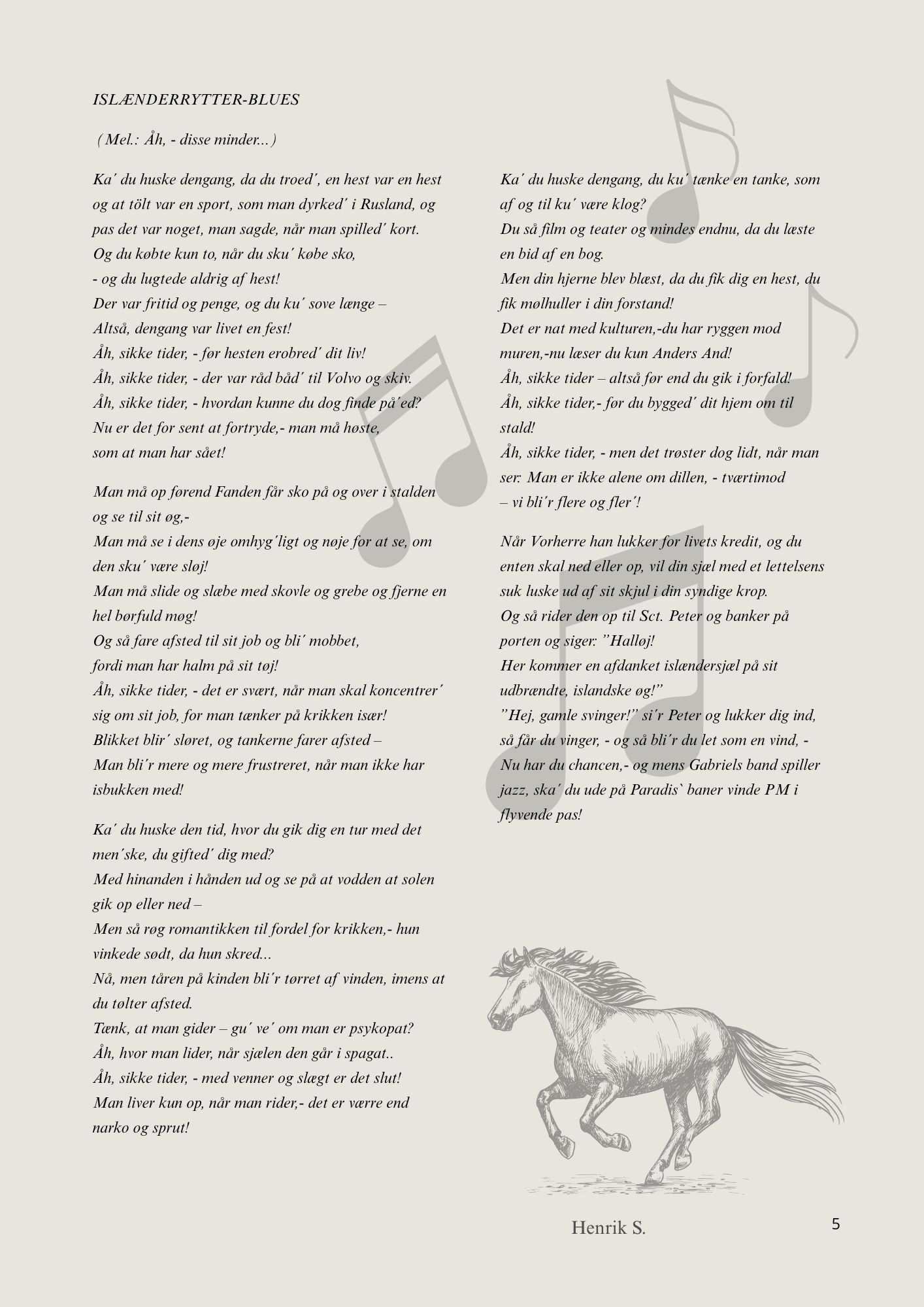 Humor og livsglæde baseret på en skarp analyse af livets mangfoldighed og en ægte interesse for sine medmennesker og den islandske hest, fik Henrik udtrykt på sin sædvanlige velformulerede og underfundige måde i sangen ”Islænderrytter-Blues”.